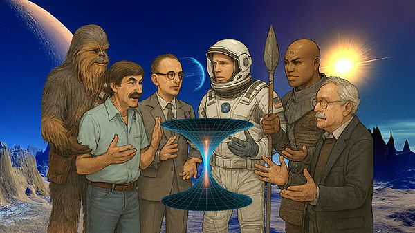 Star Wars-Wookiee Chewbacca (Peter Mayhew/Joonas Suotamo), Paul Davies, Kurt Gödel, Interstellar-Astronaut (Matthew McConaughey), Stargate-Teal‘c (Christopher Judge), Frank J. Tipler © HdW / KI-generiert mithilfe von ChatGPT